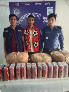 আটকের পর তার দেহ তল্লাশি ও সঙ্গে থাকা ব্যাগ থেকে ২০ কেজি গাঁজা এবং ৩০ পিস বিয়ার উদ্ধার করা হয়।